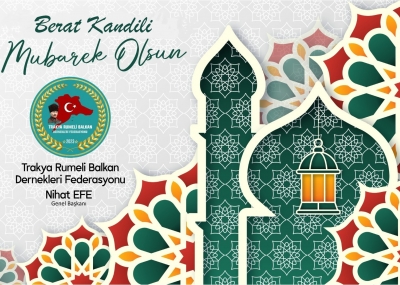 TRAKYA RUMELİ BALKAN DERNEKLERİ FEDERASYONU ÜYE DERNEKLERİMİZİN, TÜRK DÜNYASININ VE İSLAM ALEMİNİN BERAT KANDİLLERİNİ KUTLAR,HAYIRLARA VESİLE OLMASINI CENABI ALLAHTAN NİYAZ EDERİM.